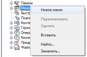 1. На вкладке "Адаптация" на панели "Адаптации <имя файла>" разверните узел "Меню", щелкнув знак "плюс" (+) рядом с ним.