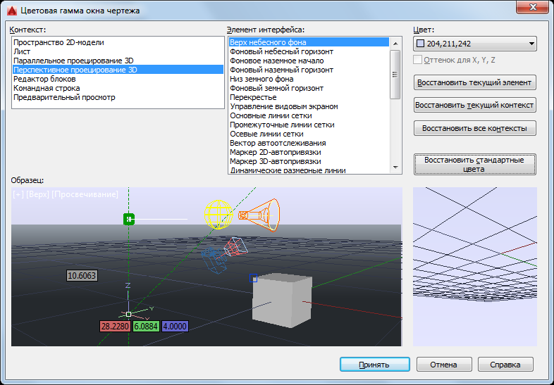 Под контекстом здесь подразумевается среда, например пространство модели. Элементам интерфейса могут назначаться разные цвета в зависимости от контекста. При выборе контекста отображается список соответствующих элементов. Выберите контекст, затем элемент интерфейса, и наконец, цвет.