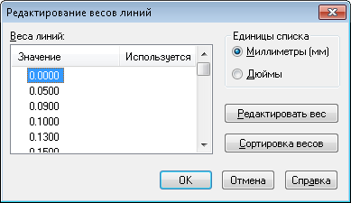Список весов линий, входящих в таблицу стилей печати. Пользователь может изменять имеющиеся веса линий, но не может добавлять и удалять веса. Изменение значения веса линий в списке воздействует на все стили печати, где он используется.