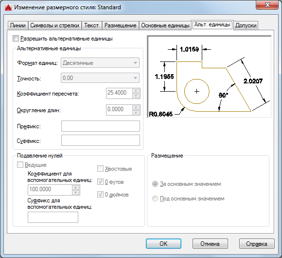 Определение коэффициента пересчета из основных единиц в альтернативные. Например, для преобразования дюймов в миллиметры ввести 25,4. Значение не оказывает влияния на угловые размеры и не применяется для точности округления или положительных и отрицательных допусков. (системная переменная DIMALTF)