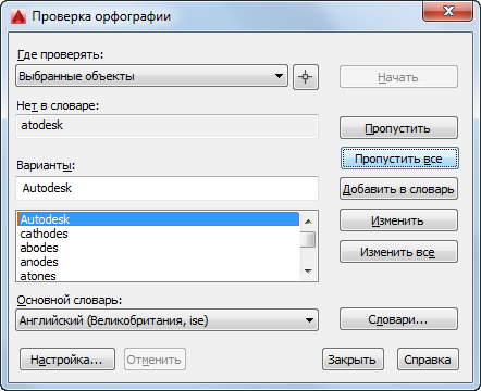 Проверка орфографии в однострочном тексте, многострочном тексте, в мультивыноске, в тексте атрибутов блоков, внешних ссылок, а также в тексте, добавленном к размерам.