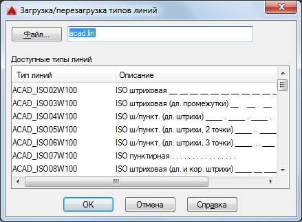 Диалоговое окно "Загрузка/перезагрузка типов линий"