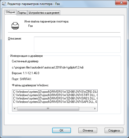 - тип драйвера (системный или несистемный), модель плоттера, путь к файлу драйвера