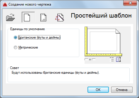 Создание нового чертежа, использующего британские систему единиц измерения. При этом размер области рисования (лимиты сетки) по умолчанию равен 12 на 9 дюймов.