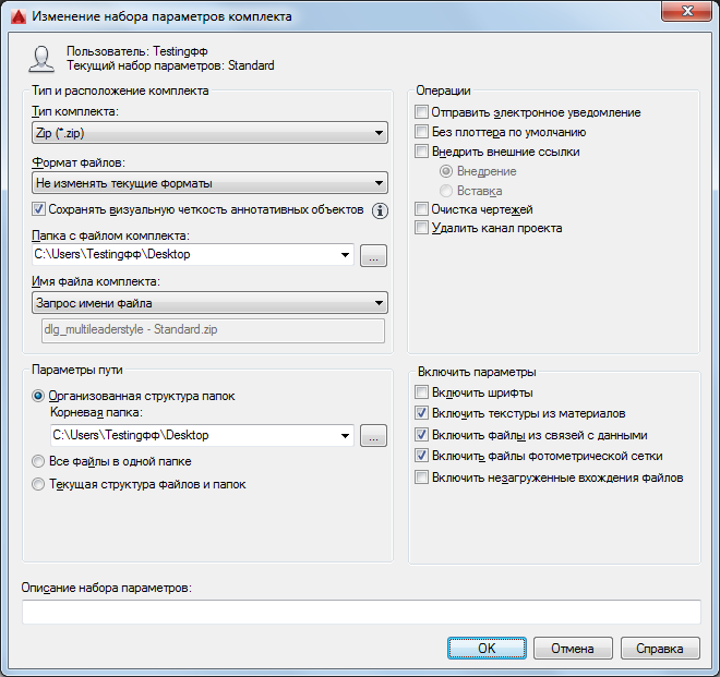 Здесь вводится текст описания набора. Описание к текущему набору отображается в окне "Формирование комплекта файлов" под списком наборов параметров. Для получения описания любого параметра комплекта можно выбрать этот параметр в списке.