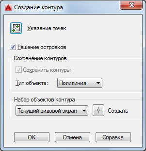 Переход к выбору объектов, которые должны учитываться при создании набора контуров. В КОНТУР входят только те объекты, которые можно использовать для создания области или замкнутой полилинии при формировании нового набора контуров.