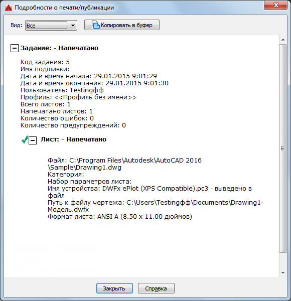 Информация о выполненных задачах печати/публикации.