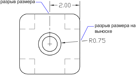 Размером разрывов можно управлять в диалоговом окне "Размерный стиль" на вкладке "Символы и стрелки". Протяженность маски размера зависит от заданного значения протяженности маски размера, масштаба размеров и текущего масштаба аннотаций для текущего видового экрана.