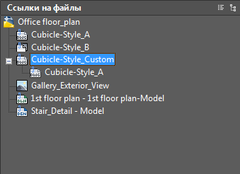 На верхнем уровне дерева всегда показывается текущий чертеж. Файлы ссылок отображаются на следующем уровне. Имеется возможность открывать файлы ссылок, содержащие собственные вложенные ссылки на файлы, и показывать более глубокие уровни. При режиме отображения в виде дерева одновременно можно выбрать только одну ссылку на файл.