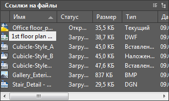 В столбце имени первой записью всегда является имя текущего чертежа, за которым следуют имена дополнительных вставленных файлов, выстроенные в порядке их вставки.