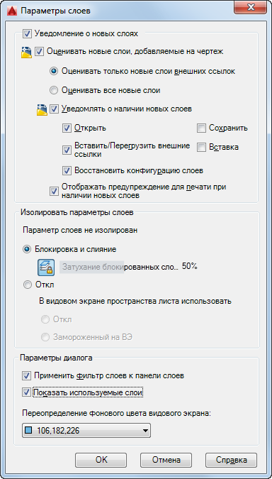 Управляет выводом уведомлений для новых слоев, поведением слоев при изоляции некоторых слоев, применением фильтров слоев к панели инструментов "Слои" и переопределениями фонового цвета видового экрана в Диспетчере свойств слоев.