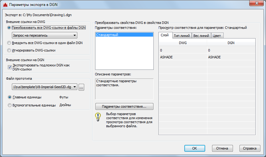 Файл прототипа для файла DGN подобен файлу шаблона чертежа (DWT), который содержит настройки по умолчанию и атрибуты, например рабочие единицы. Выбор соответствующего файла прототипа DGN (британские, метрические или определяемые пользователем единицы) и единиц преобразования является критическим для преобразования из DWG в DGN. Кроме того, файл прототипа содержит параметры, которые не присутствуют в файле DWG и, следовательно, наследуются в экспортируемом файле DGN.