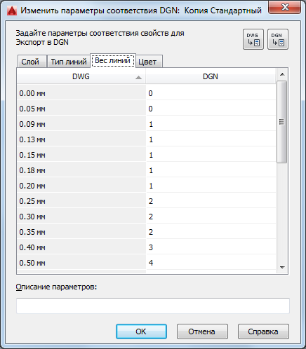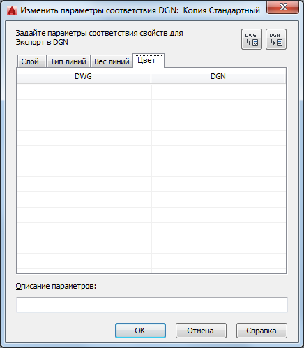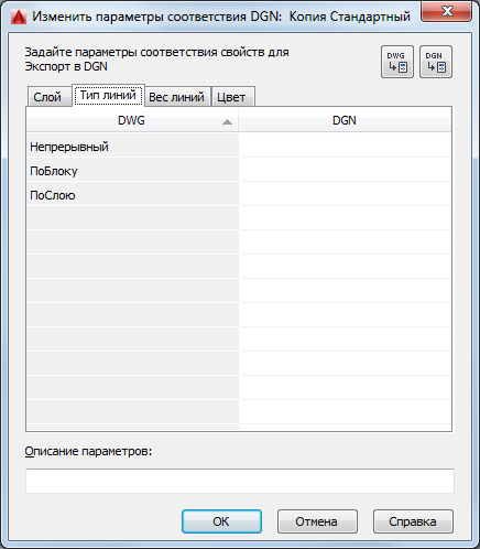 Параметры соответствия для экспорта: Если диалоговое окно "Изменить параметры соответствия DGN" вызвано путем создания нового набора параметров соответствия в диалоговом окне "Параметры экспорта в DGN", в столбце "DWG" содержатся все типы линий, определенные в текущем чертеже. Если ячейка назначения пустая (правый столбец), используется заданное по умолчанию значение соответствия системы.