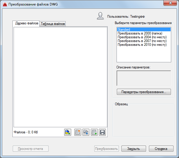 Открывает стандартное диалоговое окно выбора файлов, в котором можно выбрать файлы чертежей, добавляемых в список для преобразования. Эта кнопка находится как на вкладке "Дерево файлов", так и на вкладке "Таблица файлов".