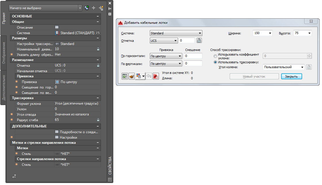 Инструменты "кабельный лоток" и "короб" относятся к особым, заранее определенным системам, например, "Питание -120В" или "Данные". На чертеже кабельные лотки или короба наследуют свойства своей системы: проектные параметры, графические свойства, а также стиль подъемов и опусков.