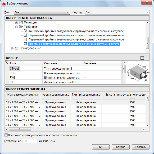 В разделе "Выбор элемента из каталога" диалогового окна фитинги воздуховодов упорядочены по типу формы.