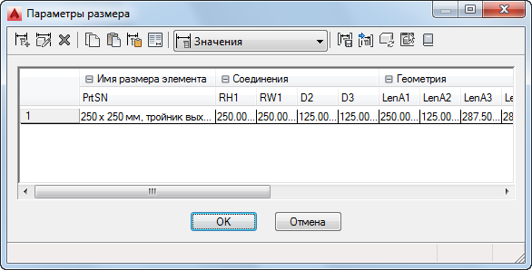 - Значения. Данный режим служит для просмотра и изменения значений параметров, если они хранятся как списки, таблицы и константы. Несколько размеров элементов задаются путем ввода нескольких значений для параметров размеров. Можно вводить значения вручную или копировать и вставлять их из другого элемента, открытого в Конструкторе содержимого, из элемента, открытого в Редакторе каталогов, или из электронной таблицы. Для параметров соединителей также можно вставить соответствующие размеры для сегментов, используемых по умолчанию во время компоновки.