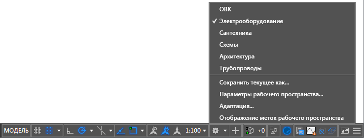Для активизации рабочего пространства выберите имя рабочего пространства из раскрывающегося списка в строке состояния приложения.