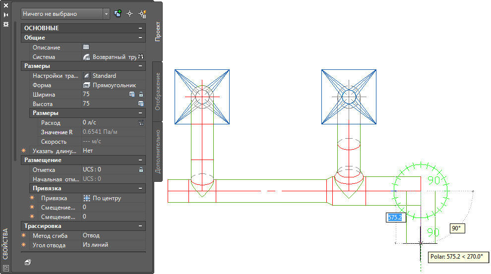 Если выпускному оборудованию назначены значения потока, в процессе рисования участков воздуховодов можно рассчитывать размеры воздуховодов с помощью инструмента определения текущих размеров. Инструментом определения текущих размеров можно также пользоваться при изменении существующих участков воздуховодов.