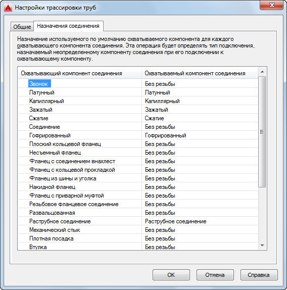- В диалоговом окне "Настройки трассировки труб" перейдите на вкладку "Назначения соединения".