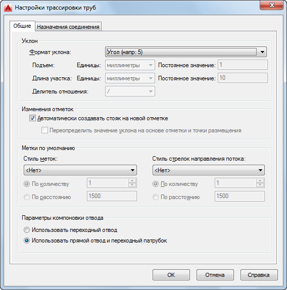 - Настройки уклонаНа вкладке "Общие" диалогового окна "Настройки трассировки труб" выберите формат уклона.