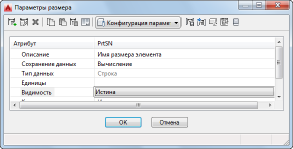 Прим.: Тип хранения данных по умолчанию для атрибута PrtSN ("Имени размера элемента") — "Таблица"; однако можно изменить тип хранения данных на "Вычисления". Определение атрибута PrtSN как вычисляемого значения позволяет определить имя каждого размера элемента на основании значений других атрибутов, например высоты и ширины, и обеспечивает дополнительные параметры в разделе "Блоки и имена" среды построения на основе блоков.