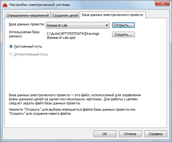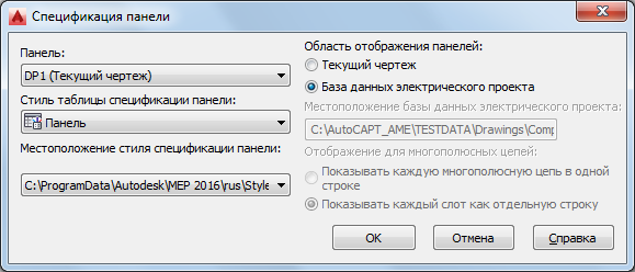 Чтобы создать спецификацию панели, которая не находится в текущем чертеже, следует указать базу данных электрического проекта (если она еще не указана) на вкладке "База данных электрического проекта" диалогового окна "Настройки электрооборудования".