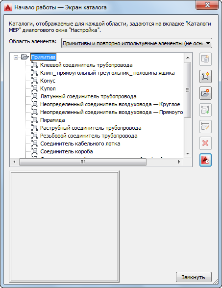 Диалоговое окно "Начало работы — Экран каталога" для примитивов