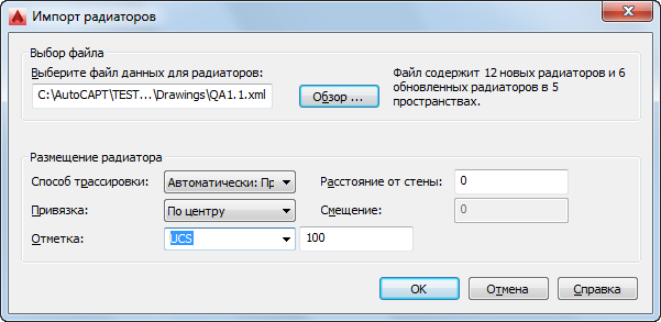 Добавить радиаторы в чертеж можно с помощью данных, содержащихся в файле XML, который сформирован программой расчета отопления, например программой SOLAR COMPUTER Desktop. Этот файл XML содержит идентификатор одного или нескольких помещений, имеющихся в модели. В этом файле идентификатор каждого помещения стоит перед списком радиаторов, подлежащих размещению в этом помещении.