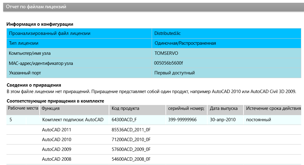 Файл сетевой лицензии, предоставляемый компанией Autodesk, содержит информацию по лицензированию, которая дает право на использование одного или нескольких продуктов Autodesk в сети. Этот файл содержит информацию об узлах сетевых серверов и управляющих программах поставщиков, а также зашифрованную цифровую подпись. Если какие-либо технические данные, например имя и идентификатор узла, неверны, это может привести к ошибкам лицензирования и невозможности использовать продукты Autodesk. Если имя узла в файле не соответствует фактическому имени узла, можно вручную отредактировать файл лицензии в текстовом редакторе. Если же в файле указан неверный идентификатор узла, необходимо запросить новый файл лицензии у компании Autodesk.