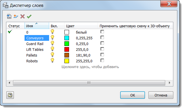 С помощью диалогового окна можно управлять слоями 3D-компонентов в компоновке Factory в Inventor: можно создавать, переименовывать и удалять слои, включать и отключать их видимость, а также назначать им цвета. Слои можно также импортировать из существующего файла DWG.