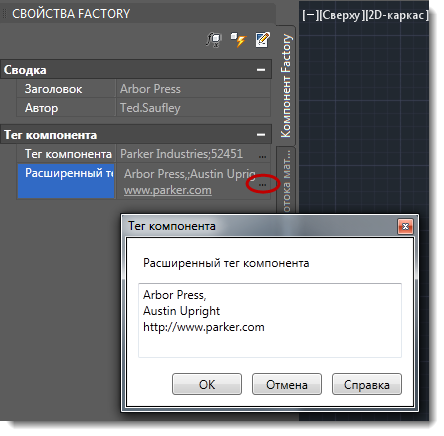 В промышленности принято назначать компонентам компании идентификаторы, или "номерные таблички". Тег компонента применяется к опубликованному компоненту или к импортированной модели (сборке) после ее размещения в компоновке Factory. Тег можно назначить в полях Тег компонента на палитре Свойства Factory.