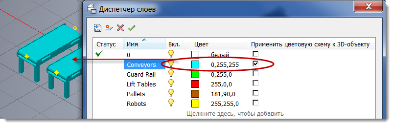 Выберите Применить цветовую схему к 3D-объекту, чтобы применить цвет слоя к его компонентам для облегчения идентификации.