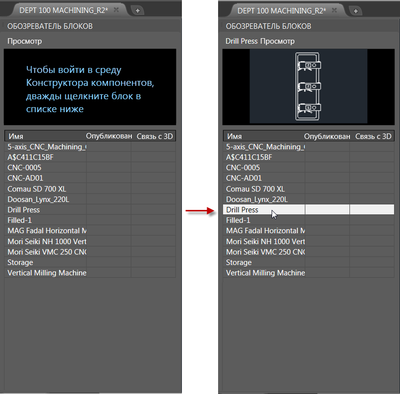 Дважды щелкните блок, который необходимо преобразовать в компонент и опубликовать. При этом выполняется вход в среду Конструктор компонентов и выбранный блок отображается в окне предварительного просмотра Обозреватель блоков, как показано на рисунке выше. Блок также выделяется в графическом окне. В Конструктор компонентов также можно перейти, щелкнув правой кнопкой мыши блок в компоновке и выбрав Factory > Конструктор компонентов в контекстном меню.
