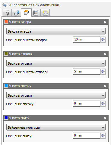 В режиме высоты отвода задается высота, на которую поднимается инструмент перед следующим проходом резания. Значение режима высоты отвода должно быть больше значения высоты подачи и верхней точки. Режим высоты отвода используется вместе с последующим смещением для определения высоты.