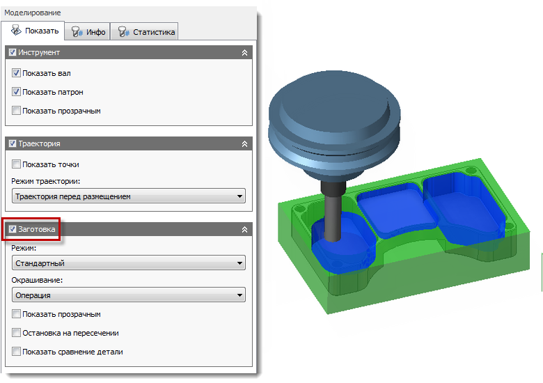 В раскрывающемся меню Режим есть два параметра для отображения моделирования заготовки.