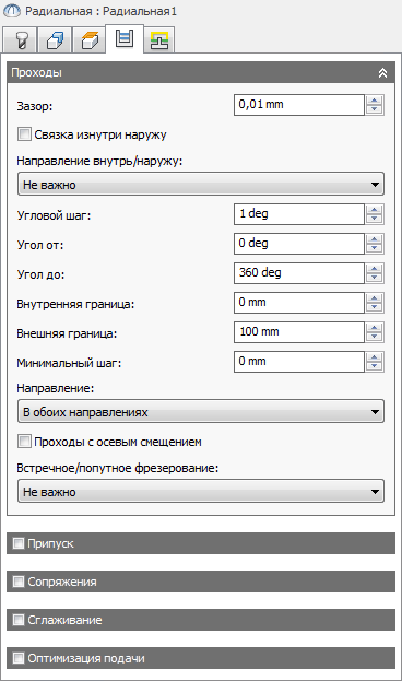 Проходы могут быть связаны в зигзагообразный массив между наружным и внутренним радиусом по направлению изнутри наружу или снаружи вовнутрь. Кроме того, их можно автоматически разделить для получения проходов попутного или встречного фрезерования.