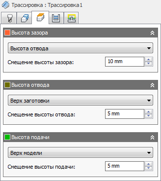Параметр "Высота отвода" позволяет задать высоту, на которую поднимается инструмент перед следующим шагом резки. Значение высоты отвода должно быть выше значений параметров Высота подачи и Высота сверху. Параметр "Высота отвода" используется вместе с последующим смещением для задания высоты.