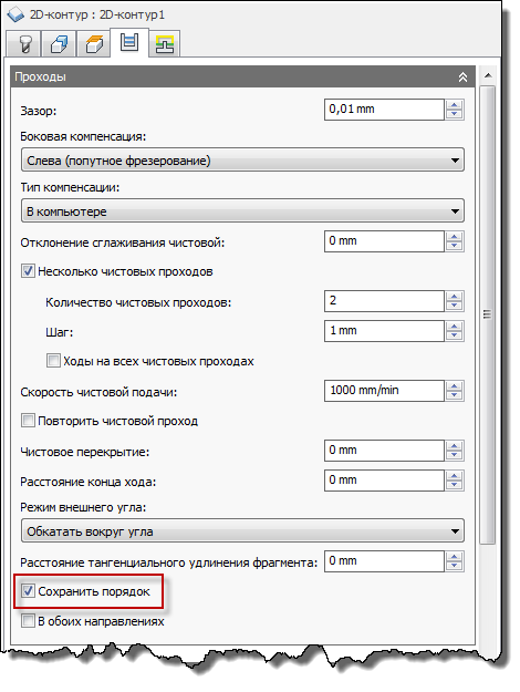 Для управления упорядочиванием вручную выберите отдельные контуры в том порядке, в котором они должны обрабатываться, и установите флажок Сохранить порядок на вкладке Проходы.