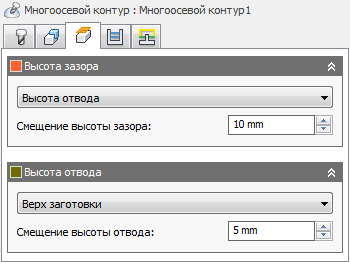 Параметр "Высота отвода" позволяет задать высоту, на которую поднимается инструмент перед следующим шагом резки. Значение высоты отвода должно быть выше значений параметров Высота подачи и Высота сверху. Параметр "Высота отвода" используется вместе с последующим смещением для задания высоты.
