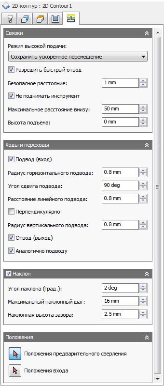 Указание максимального шага понижения на оборот профиля уклона. Этот параметр позволяет ограничить нагрузку на инструмент при выполнении вырезов в полную ширину в процессе создания уклона.