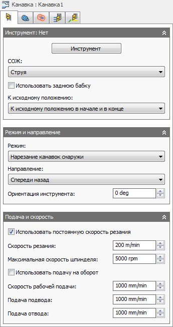 С помощью этого параметра можно выбрать метод обточки ("Профиль" или "Канавка") и соответствующим образом настроить перемещение инструмента при обработке вдоль оси или по окружности, а также направление подвода и отвода.
