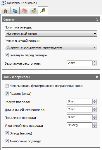 Управление способом отвода инструмента до диаметра просвета после каждого прохода резания или просто отводом на небольшое расстояние от заданного участка обработки. Расстояние определяется значением Безопасное расстояние.