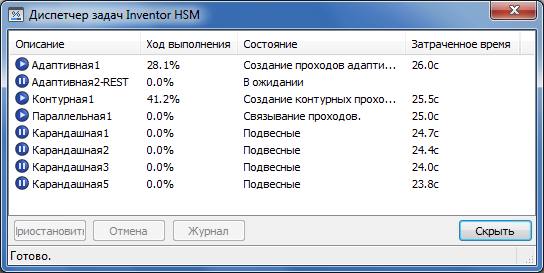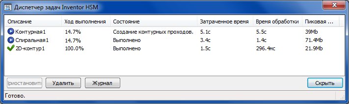 Inventor HSM позволяет продолжить работу в Inventor при создании траектории перемещения инструментов в фоновом режиме. Основным интерфейсом управления созданием траектории перемещения инструмента является Inventor HSM Диспетчер задач Inventor HSM Pro.