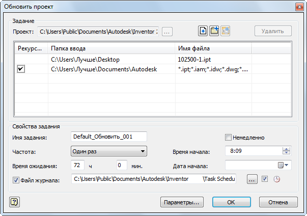 - Настоятельно рекомендуется создать резервные копии всех файлов Autodesk Inventor, прежде чем использовать планировщик заданий. Убедитесь в том, что резервная копия сохраняет исходную структуру папки, чтобы можно было легко восстановить файлы при необходимости. (Включены все файлы, используемые в проектах: файлы деталей (IPT), сборок (.iam), схем (.ipn), чертежей (idw), таблиц Microsoft Excel (.xls), параметрических элементов (.ide) и проектов (IPJ).)