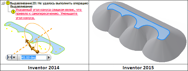 Улучшена устойчивость создания оболочки и конических выдавливаний. Теперь они применяются для более сложных объектов геометрии. Например, в Inventor 2014 можно выдавить следующий профиль с правильной зависимостью касательности с углом конуса не более 27 градусов. В Inventor 2015 угол конуса может варьироваться в диапазоне от 0 до 90 градусов.