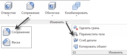 Некоторые команды перемещены из основной панели во вложенную или раскрывающийся список на панели. Например, в файле детали (IPT) панель "Изменить" на вкладке "3D-модель" теперь оптимизирована и на ней отображается меньшее число команд по умолчанию. Другие команды панели "Изменить" перемещены в раскрывающееся меню или на развернутую панель "Изменить":