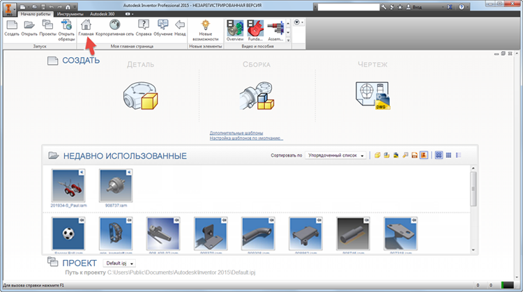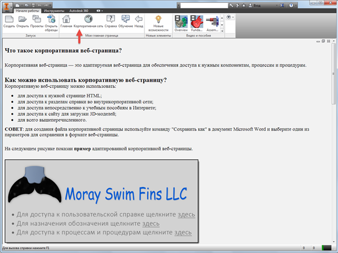 Можно запустить корпоративную веб-страницу из различных мест, включая вкладку "Начало работы", панель "Моя главная страница". Параметр приложения на вкладке "Файлы" позволяет сделать корпоративную веб-страницу страницей по умолчанию для домашней страницы Inventor.