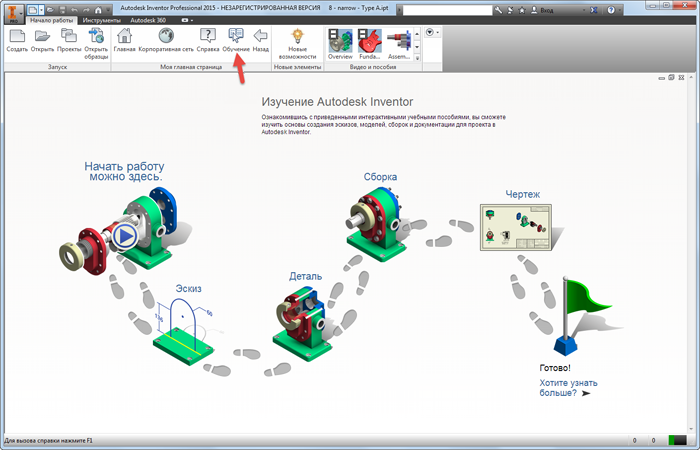 Нажмите кнопку "Обучение" на вкладке "Начало работы" панели "Главная" для доступа к ресурсам для обучения. Учебные пособия позволяют поэтапно изучить основы работы с эскизами и деталями, сборками и чертежами в виде непрерывного рабочего процесса. Отслеживание хода выполнения показывает, что уже завершено. Улучшенный интерфейс интерактивного учебного пособия обеспечивает лучшее визуальное представление.