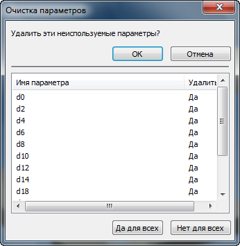 В нижней части диалогового окна "Параметры" выберите "Удалить неиспользуемые элементы". В отдельном окне появится список всех неиспользуемых параметров. Здесь их можно удалить одим действием. Необходимо выбрать Да для всех, чтобы удалить все неиспользуемые параметры в документе, или Нет для всех, чтобы оставить неиспользуемые параметры в текущем документе.